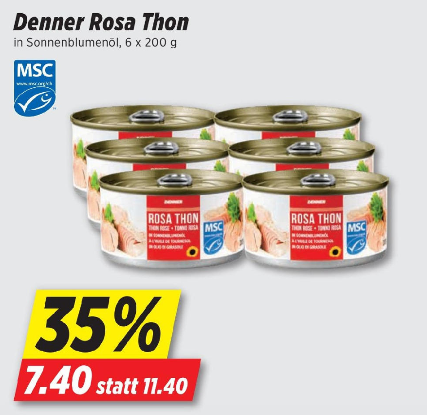 Auch interessant dürfte die Aktion für den rosa Thon sein. Diesen gibt’s als 6x200g Packung für CHF 7.40.