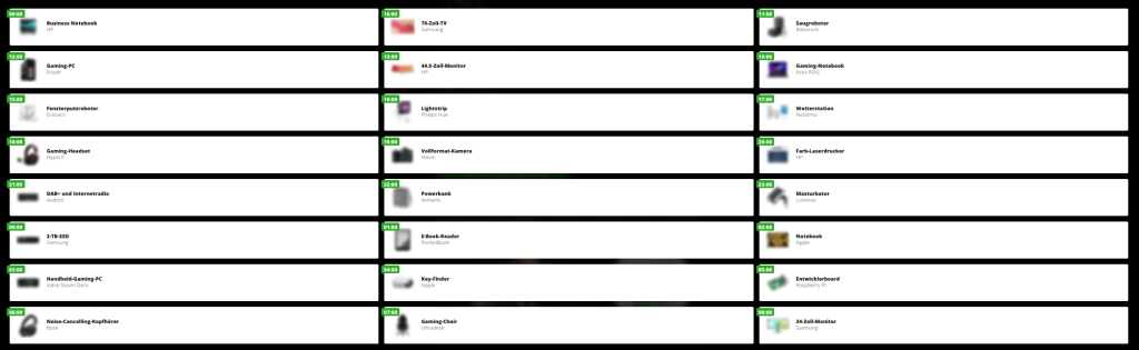 Auf der Countdown-Seite des Dealday von Daydeal / Brack.ch kann man einige Sekunden lang die Produkte von jeder Stunde sehen (geblurred). Hilft trotzdem dabei, zu entscheiden ob man wach bleiben soll oder wann es sich lohnt, zuzuschlagen.