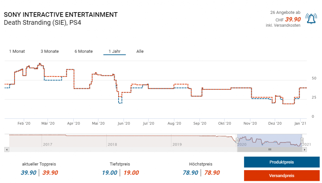 Bei amazon.de gibts derzeit das Videospiel Death Stranding für die Playstation 4 zum Aktionspreis von knapp 21 Franken. Laut toppreise verlangen die hiesigen Händler hierzulande knapp 40 Franken dafür, ich glaube der Preis lag aber schon ähnlich tief. Laut toppreise lag der Bestpreis bei 19 Franken.