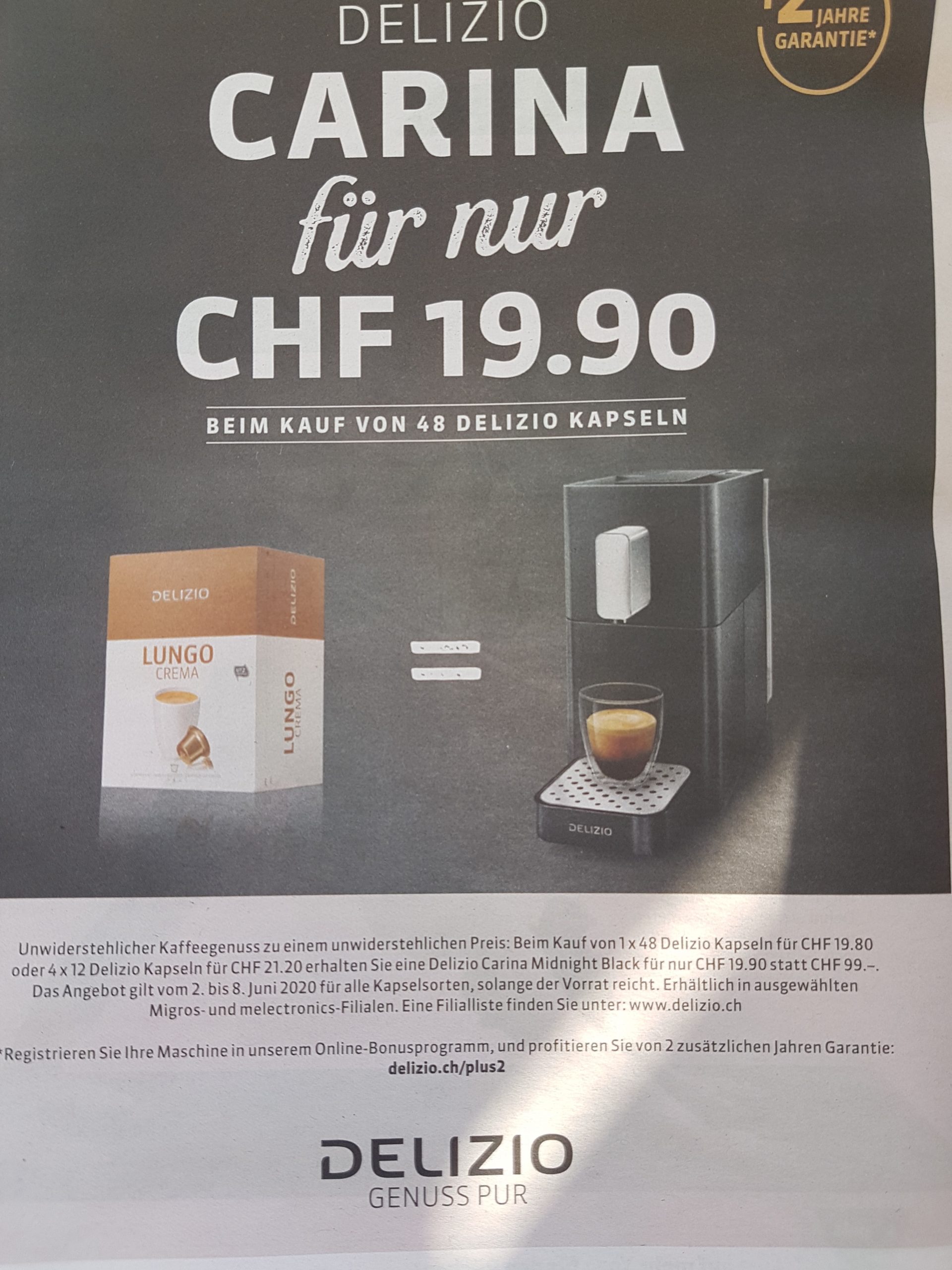 Delizio Carina für 19.90 CHF wenn man 1x 48 Kapseln kauft für 19.80 CHF Update - 2020.06.05Die Aktion läuft jetzt auch Online bei Delizio! Aus der Migroszeitung Bei melectronics ohne Kapseln zum gleichen Preis