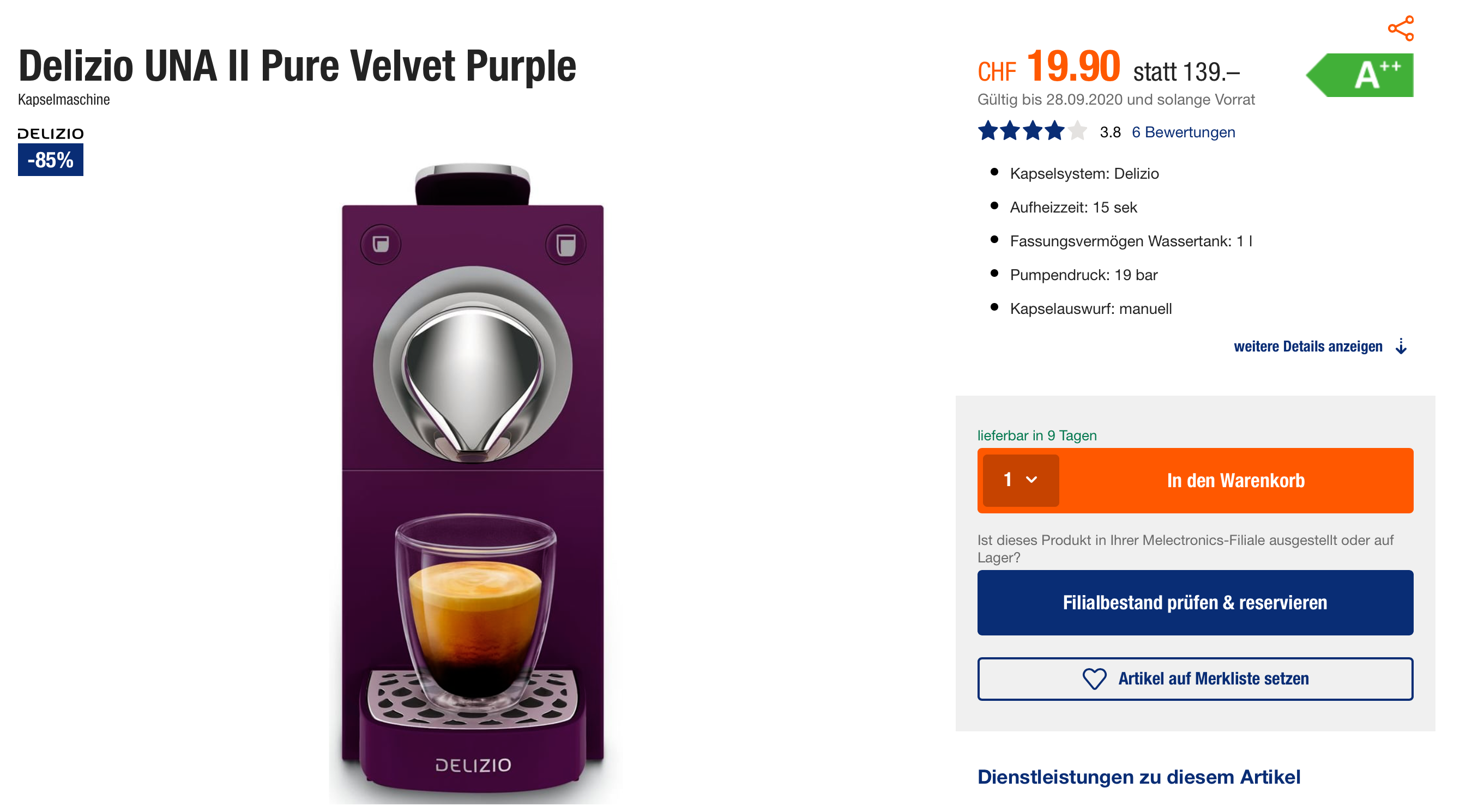 Nein, die Kaffeemaschine gibt es momentan echt für diesen Preis (gab es früher übrigens auch ab und zu zu diesem Kurs...). Da Delizio selber momentan eine Promo mit der Delizio UNA Maschine und 48 Kapseln für CHF 39.70 hat, kann man in den melectronics Filialen daher aktuell die Maschine alleine für CHF 19.90 bekommen.