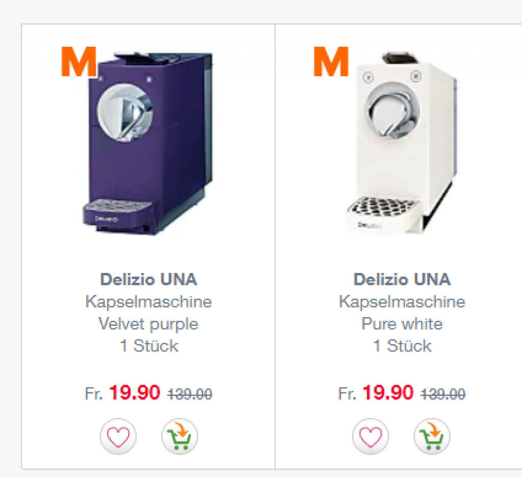 Bei LeShop erhält man gerade die Delizio Una Kaffeemaschine für CHF 19.90. Ist eine wirklich gute Kaffeemaschine, habe ich selbst zu Hause. Kann mit den Migros Budget Kapseln betrieben werden. Die Delizio Una gibt’s immer mal wieder in sehr starker Aktion, als Normalpreis erhält man die Maschine meistens für etwas über 100 Franken.