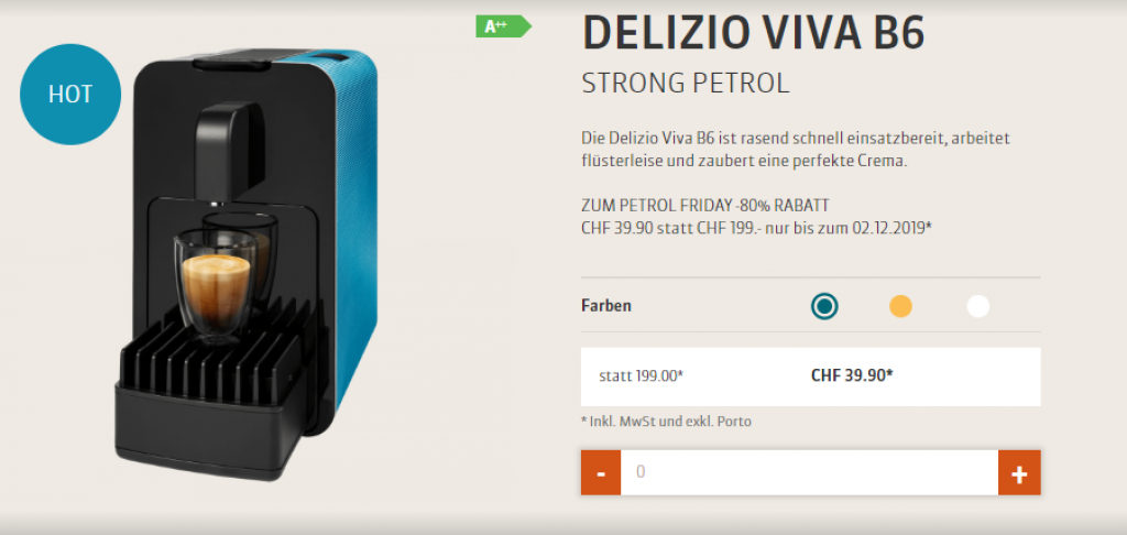 Bei Delizio kommen auf den obigen Preis noch 5.- Porto dazu. Dann doch lieber die Viva Elegante für 49.90 bei Fust kaufen und dazu gleich noch gratis 192 Kaffeekapseln abstauben.