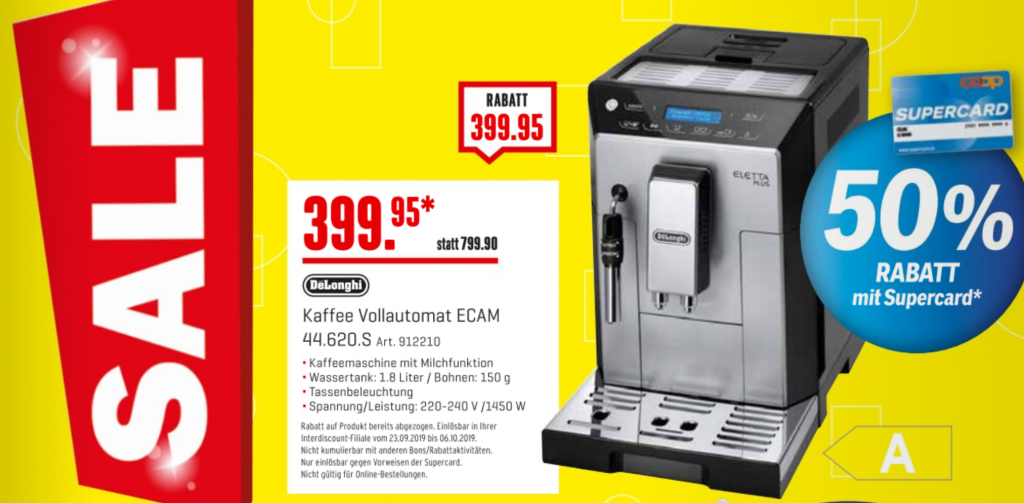 Für Supercard Inhaber gibt es bei Interdiscount die o.g. Kaffeemaschine zum sehr günstigen Preis von 399.95 anstatt 799 CHF