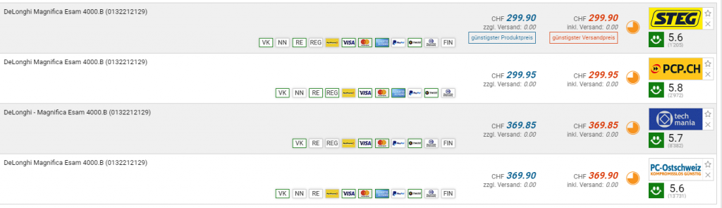 Bei Steg und dem Partner PCP gibt es den DeLonghi Magnifica Kaffeevollautomat für den neuen Bestpreis von CHF 299.90. Der vorherige Bestpreis war CHF 340.60. Der zweitbeste Preis beträgt CHF 369.85.