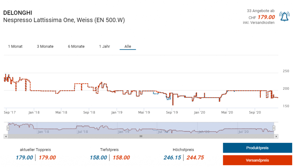 Bei nettoshop gibts derzeit die Nespresso-Maschine Lattissima One EN500.W von De’Longhi zum Preis von 179 Franken, in Kombination mit dem 20 Franken Bon ergibt sich allerdings ein interessanter Preis.