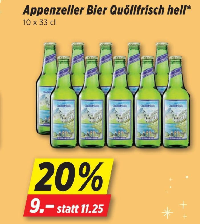 Wie zum Beispiel auf Appenzeller Bier Quöllfrisch hell 10x33cl: für CHF 7.20 statt den reduzierten CHF 9.-