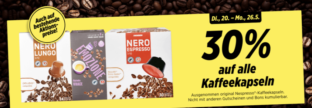 Im Denner gibts zurzeit bis Montag, den 26.05.2025, 30% auf Kaffeekapseln.