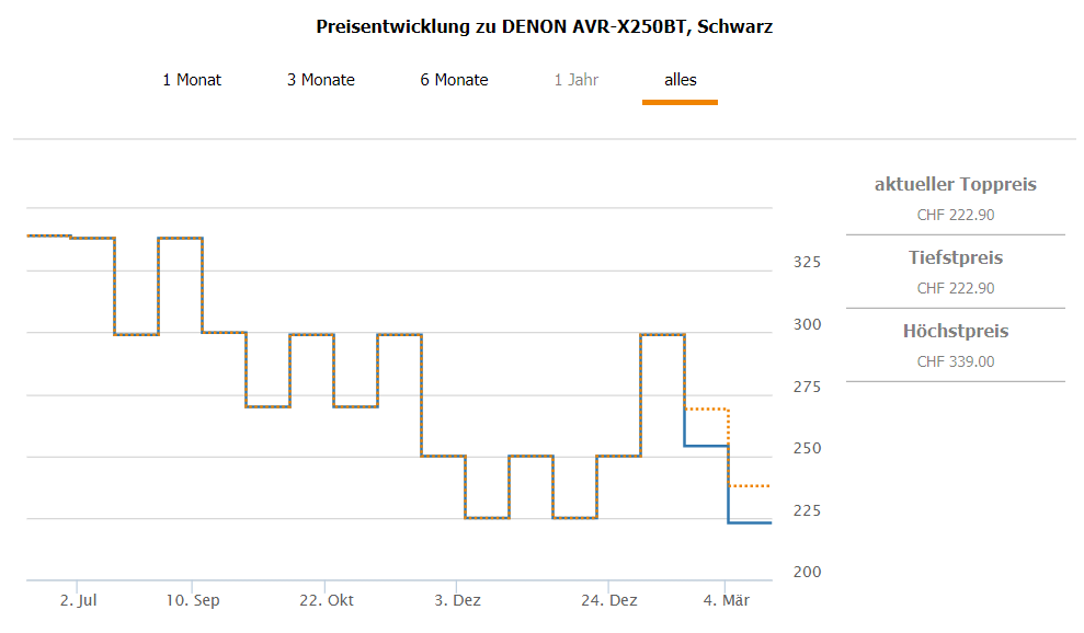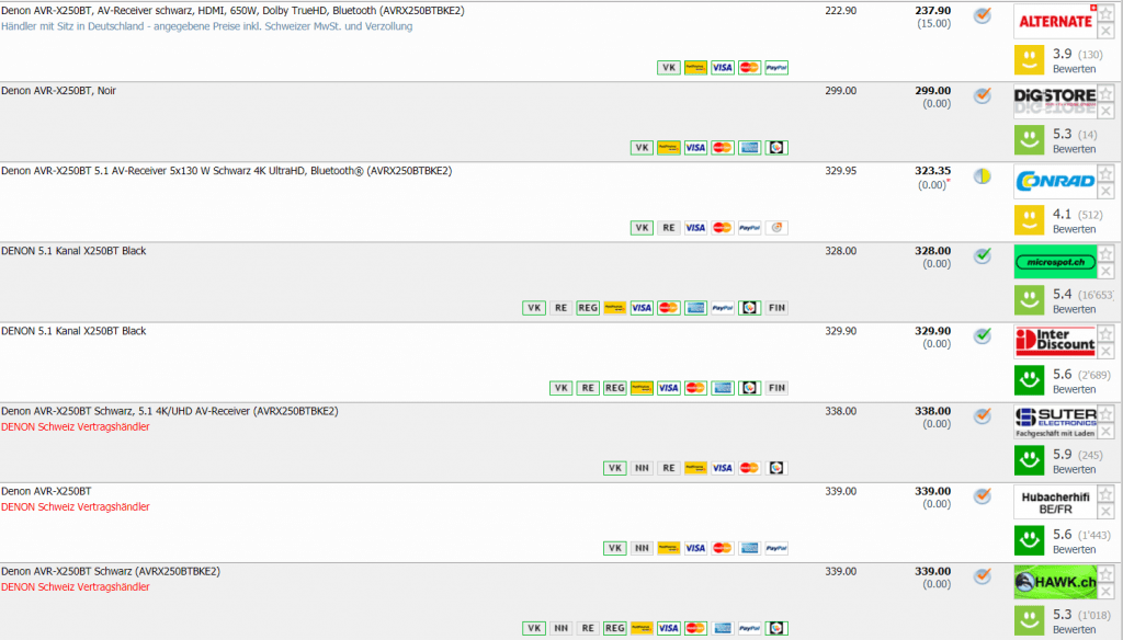 Bei digitec im Tagesdeal gibt’s heute den Denon AVR-X250BT 5.1 Kanal AV-Receiver mit Bluetooth für CHF 199.- Laut toppreise war der Bestpreis bei CHF 222.90. Der zweitbeste Preis beträgt CHF 237.90