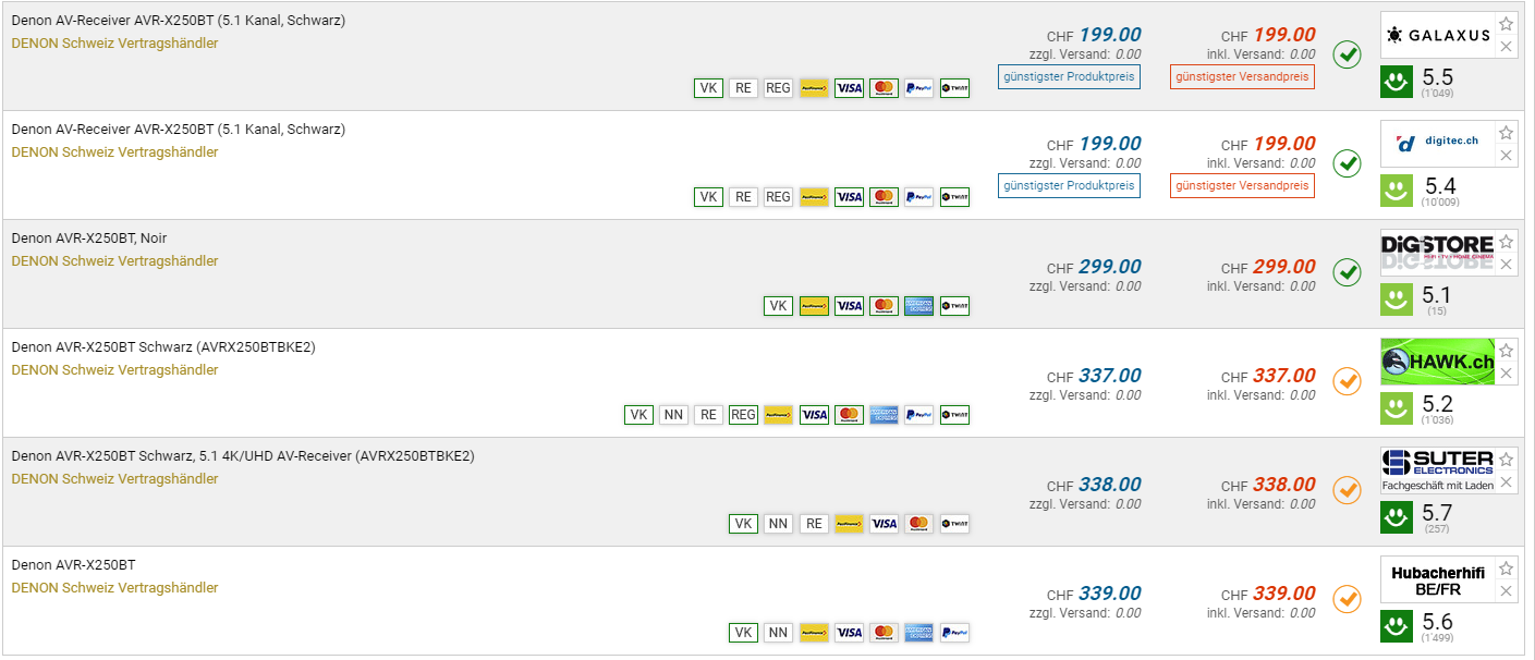 Bei Galaxus und dem Schwestern-Shop Digitec gibt es das DENON AVR-X250BT für den neuen Bestpreis von CHF 199.-. Der vorherige Bestpreis war CHF 224.90. Der zweitbeste Preis beträgt CHF 299.-.