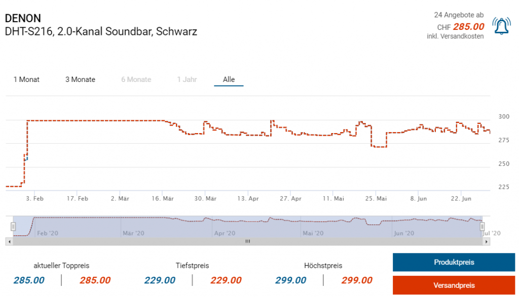 Bei Amazon gibts derzeit die 2.1 Siundbar mit integriertem Subwoofer von Denon zum neuen Bestpreis von 186 Franken. Laut toppreise lag der bisher tiefstgemessene Preis bei 229 Franken, derzeit würde es aber mindestens 285 Franken kosten.