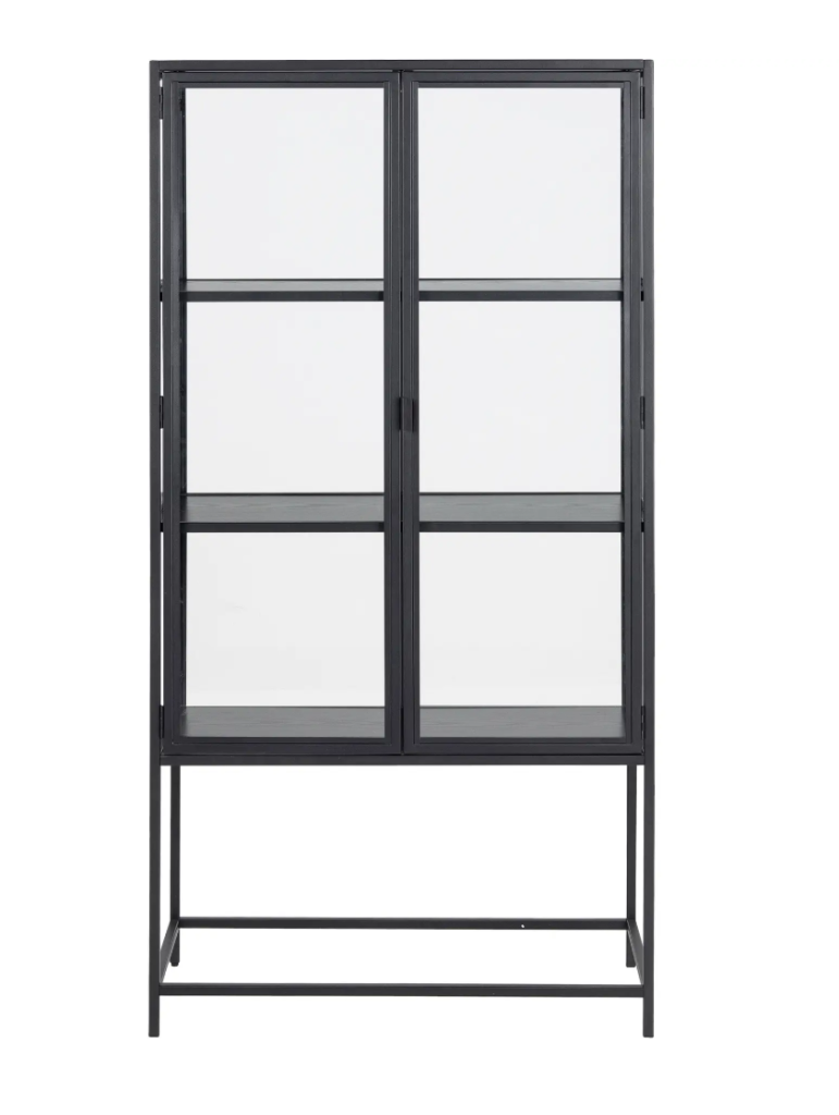 Die Vitrine Quinto kombiniert modernes Design mit hochwertiger Verarbeitung aus schwarz lackiertem Metall und transparentem Glas. Mit ihren Massen von 150 cm Höhe, 77 cm Breite und 35 cm Tiefe bietet sie auf drei Regalböden und vier stabilen Füssen viel Raum für stilvolle Aufbewahrung und Präsentation. Zwei Türen mit schwarzen Metallgriffen und ein Gewicht von 37.5 kg unterstreichen den eleganten Charakter dieses unmontierten Möbelstücks.
