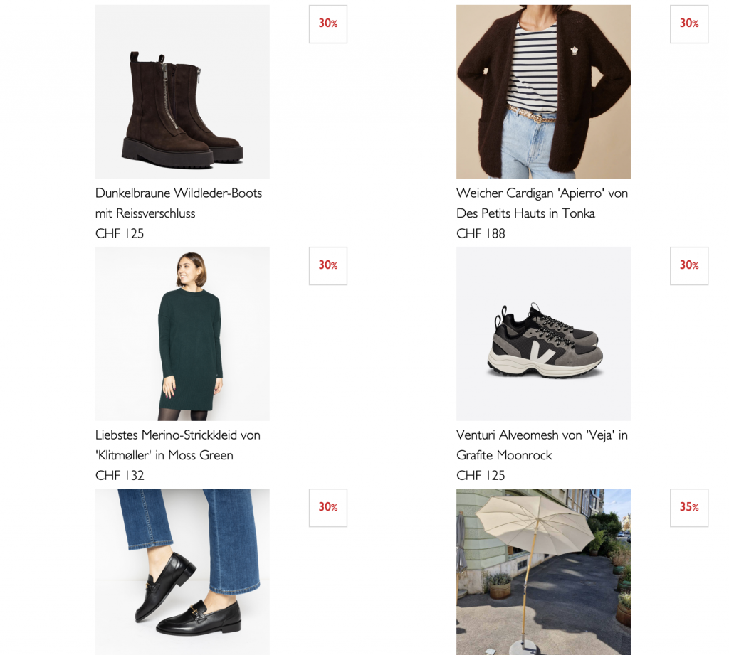 Bei Moors.ch ist gerade ein Lagerverkauf. Es hat neben einigen Designmöbeln auch Kleider mit reduzierten Preisen.
