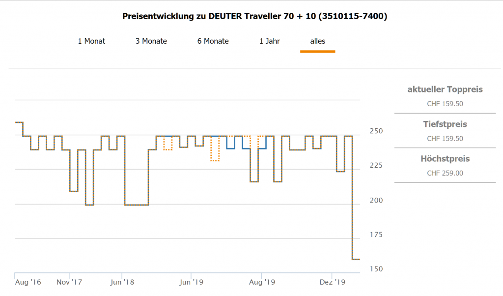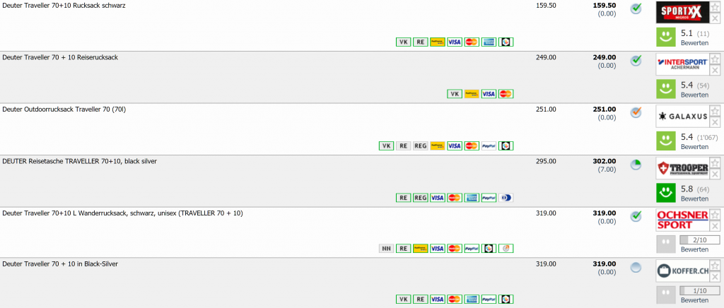 Bei SportXX gibt’s den Deuter Traveller 70+10 Rucksack für CHF 159.50, Bestpreis bisher für dieses Modell lag bei CHF 199.- Zweitbester Preis beträgt CHF 249.-
