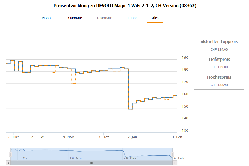 Bestprice bislang waren 149.- CHF, der zweitbeste Preis liegt aktuell bei 159.95 CHF.