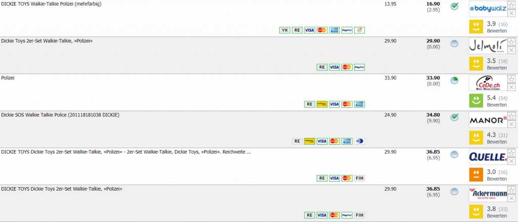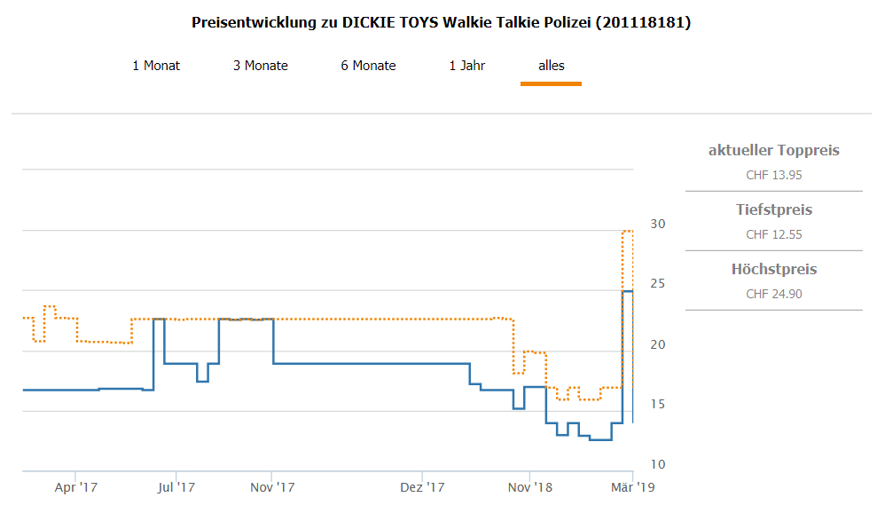 Bei Baby-Walz erhält man gerade das Dickie Toys Walkie-Talkie mit Polizeimotiv für CHF 16.90 inkl. Lieferung. Zweitbester Preis CHF 29.90 Gab es schon einmal so günstig, also kein Hammer-Deal, aber ein beliebtes Oster-Geschenk für Kinder, das bei anderen Händlern mehr als doppelt so teuer ist.