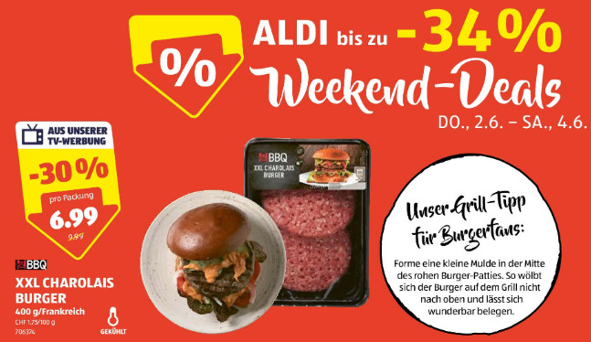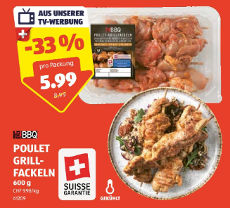 Ab heute bis zum Samstag 4.6. könnt ihr euch Poulet-Grillfackeln à 600g zum günstigen Kurs von 5.99 Franken sichern. Auch interessant: 400g Charolais XXL-Burger aus Frankreich für 6.99 Franken.