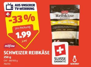 Ein weiteres gutes Angebot stellt meiner Meinung nach der Schweizer Reibkäse dar. Diesen gibts am Dienstag und Mittwoch (7.6. + 8.6.) als 250g-Packung für nur 1.99 Franken! Es ist aber wohl eine Mischung aus verschiedenen Käsen.