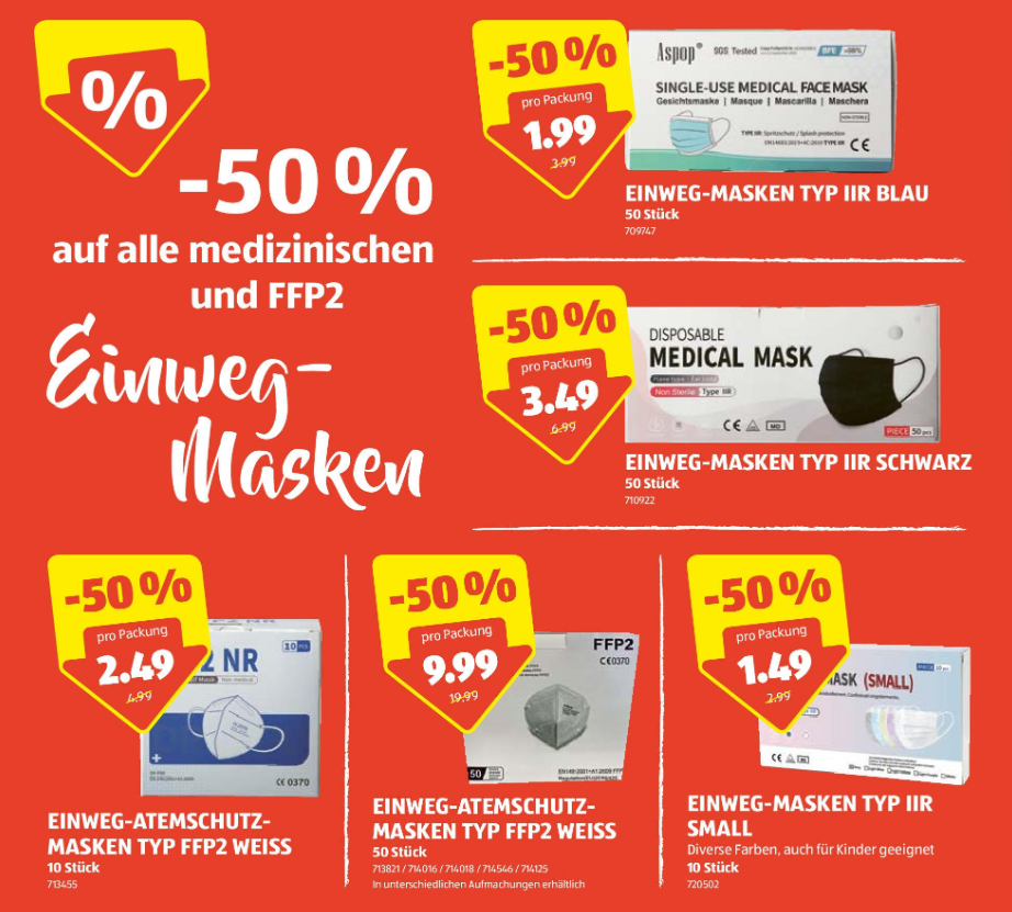 In Aktion sind auch diverse Masken (medzinische Hygiene- als auch FFP2-Masken). Für nur 10 Franken gibt’s so das 50er-Pack an FFP2-Masken in neutraler Farbe.