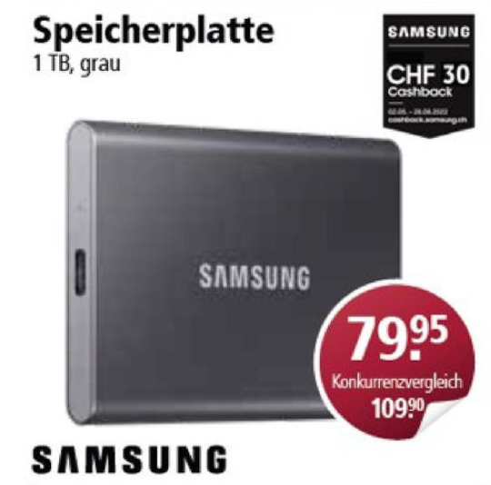 Zum Beispiel findet ihr die Samsung T7 SSD zum Spitzenpreis von 79.95 Franken. Abzgl. der Cashback-Promo ergibt dies einen Preis von CHF 49.95!