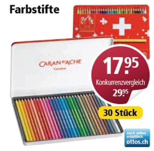Als erster Deal etwas für die Kreativen unter uns: Ihr könnt das 30er Set Buntstifte vom Schweizer Traditionsunternehmen Caran d’Ache zum Aktionspreis von 17.95 Franken kaufen. Der Vergleichspreis anderer Händler bei Abholung beträgt hier ca. 24 Franken.