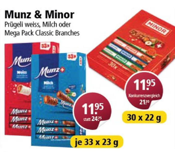 Auch interessant dürften die grösseren Packungen für Schoggistängel von Munz und Minor sein. Diese gibt’s für 11.95 Franken!
