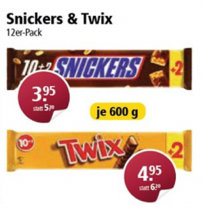 Das 12er-Pack Snickers und Twix gibt’s für CHF 3.95 resp. CHF 4.95. Macht ca. 33 Rappen pro Snickers resp. ca. 42 Rappen pro Twix-Päckli.