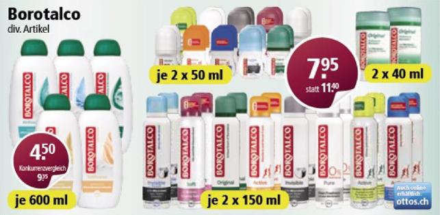 Ebenfalls in Aktion sind die Produkte von Borotalco. So könnt ihr euch gleich einen Vorrat sichern und dabei ab 60 Franken Einkauf den 10 Franken Gutschein einlösen, um maximal zu sparen!