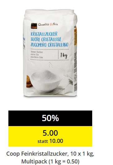 COOP Kristallzucker 10x 1kg für CHF 5.- statt CHF 10.-.