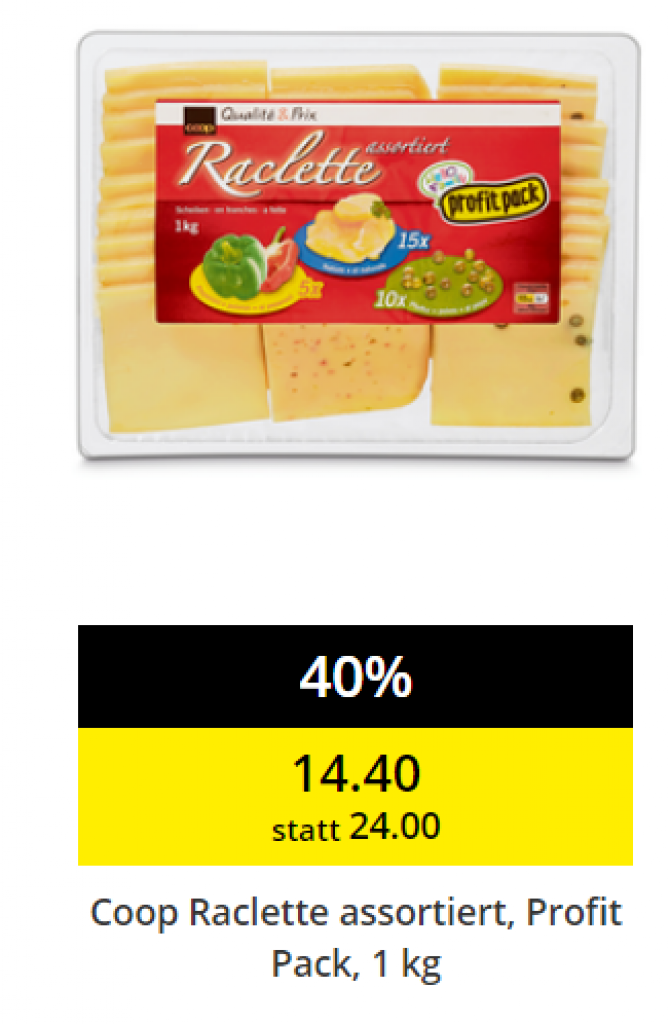 COOP Raclette Käse 1kg CHF 14.40 statt CHF 24.-.