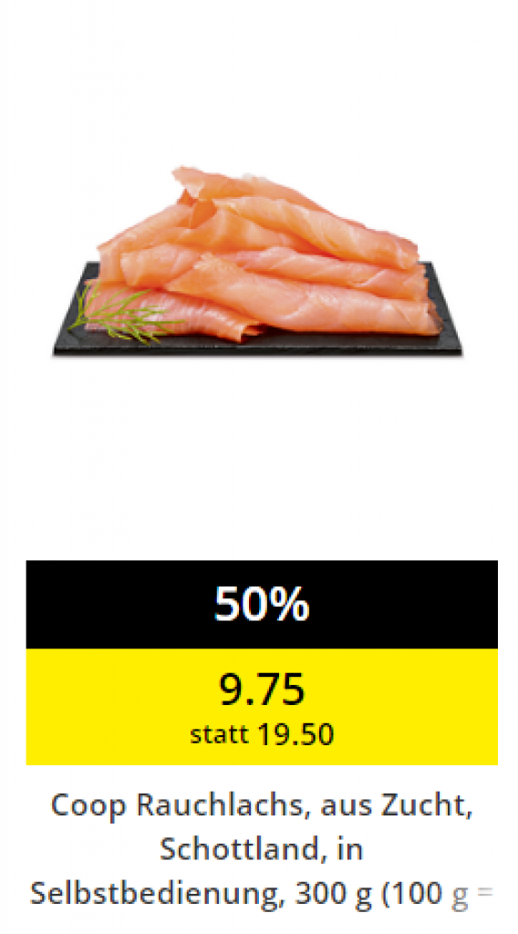 Der Coop Rauchlachs aus Schottland wird für CHF 9.75 angeboten anstatt für CHF 19.50.