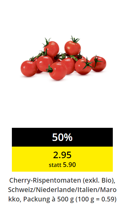 Cherry Rispentomaten gibt es um 50% reduziert. Diese Woche kosten sie CHF 2.95 anstatt CHF 5.90.