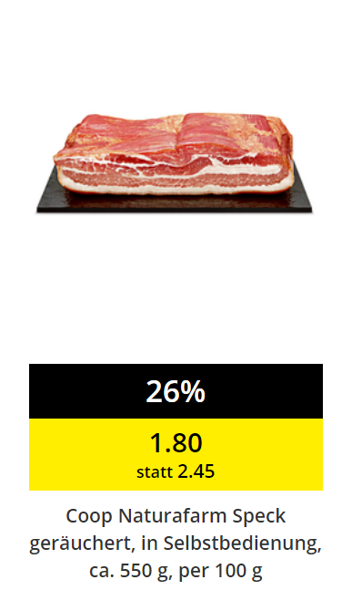 Den Coop Naturafarm Speck (geräuchert) gibt es für CHF 1.80 per 100g.