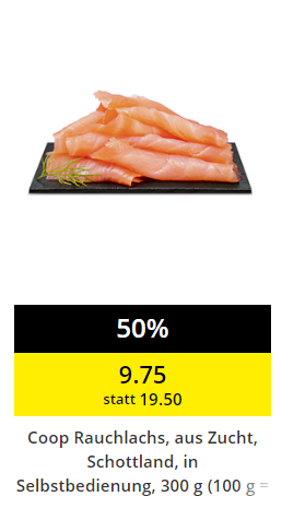 Der Coop Rauchlachs aus Schottland wird für CHF 9.75 angeboten anstatt für CHF 19.50.