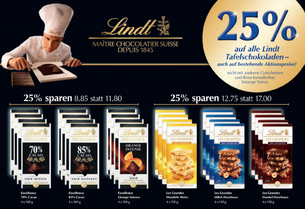 Und zuletzt noch gibt’s eine Aktion für Schokoladen-Liebhaber. Hier gibt’s 25% Rabatt auf alle Tafelschokoladen.