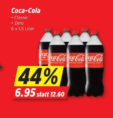 Ebenfalls in Aktion ist die beliebte Coca Cola für 6.95 Franken pro 6er Pack 1.5l-Flaschen: