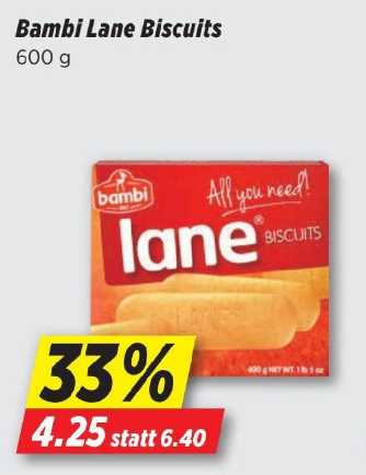 Die Balkanesen und sonstige Freunde von Südosteuropa kennen die beliebten Frühstücks-Biscuits von Bambi. Ihr kriegt nämlich die Kekse Lane (oder wie man das „dune“ Plazma Keks nennt) in der 600g-Packung für 4.25 Franken.