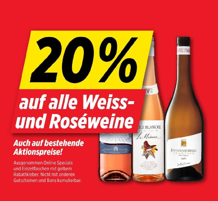 Als „Wochenendknaller“ gibt’s nebst anderen interessanten Angeboten wieder einmal 20% Rabatt auf Weiss- und Roséweine (auch bestehende Aktionen).
