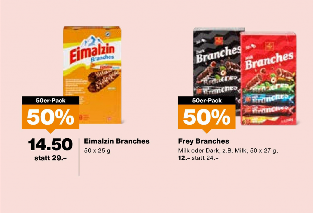So gibt’s 50 Stück Schokoladenstängel der Marke Frey oder Eimalzin mit 50% Rabatt für 12 resp. 14.50 Franken.