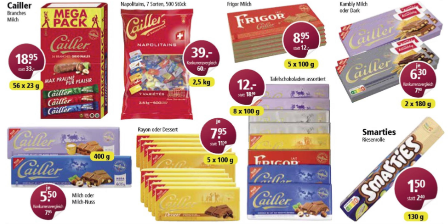 Es finden sich auch bei den Lebensmitteln einige interessante Angebote. Derzeit sind viele Produkte von Cailler in Aktion, aber auch die Riesenrolle Smarties gibt’s für 1.50 Franken.