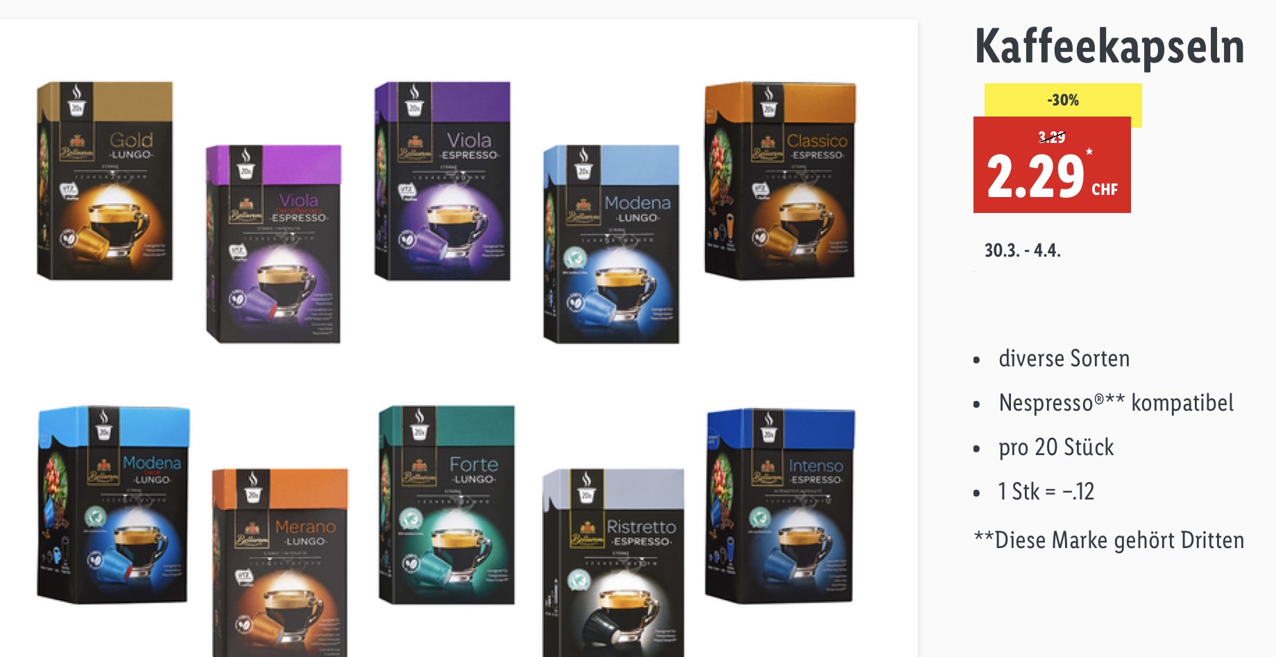 Bei Lidl gibt’s ab dem 30.03. die selbsternannten „günstigsten Kaffeekapseln der Schweiz“! Und diese sind beim Preis wirklich tief. Ihr zahlt für das 20er-Pack 2.30 Franken, was gerade einmal 11.5 Rappen pro Kapsel ausmacht! Ausserdem stehen euch ganze 10 verschiedene Sorten zur Auswahl. Das Angebot gilt bis zum 04.04.23 oder solange Vorrat 😉