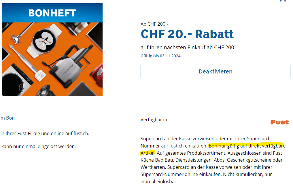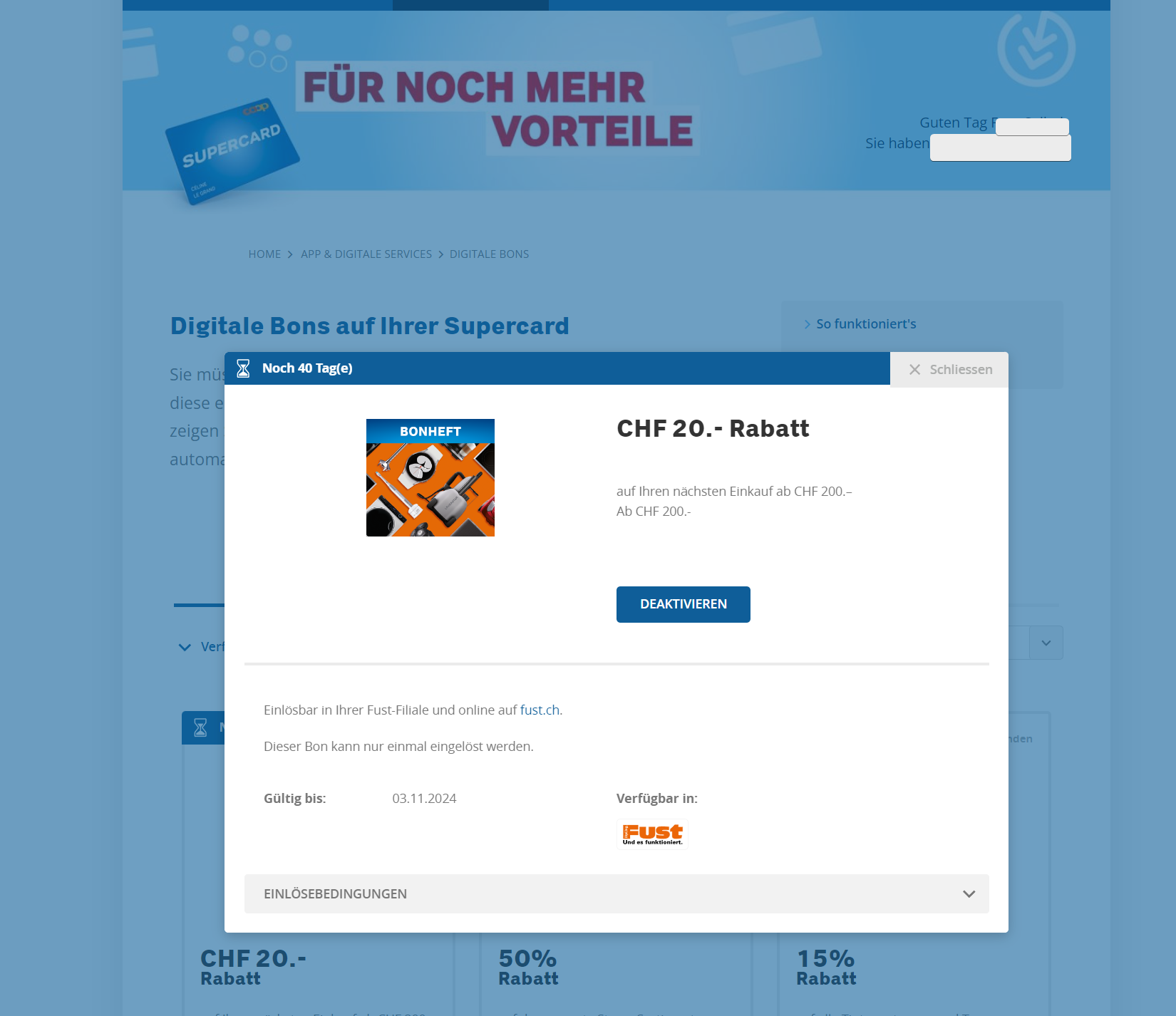 In der Supercard App den 20.- Franken Gutschein aktivieren.