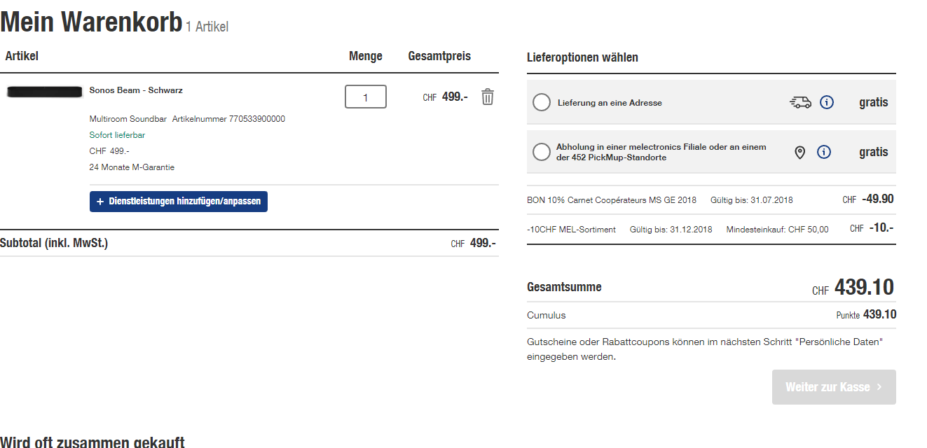 oder direkt bei sonos bestellen...habe dort 411CHF bezahlt. Ist wahrscheinlich ein Bug im System. Erst ein Land wie Slowakei beim Versand wählen und dann die Schweiz..und schwupps..keine Mehrwertsteuer und auch keine Versandkosten. Hat bei meinen Sonos One und jetzt auch beim Beam wunderbar geklappt. :-)