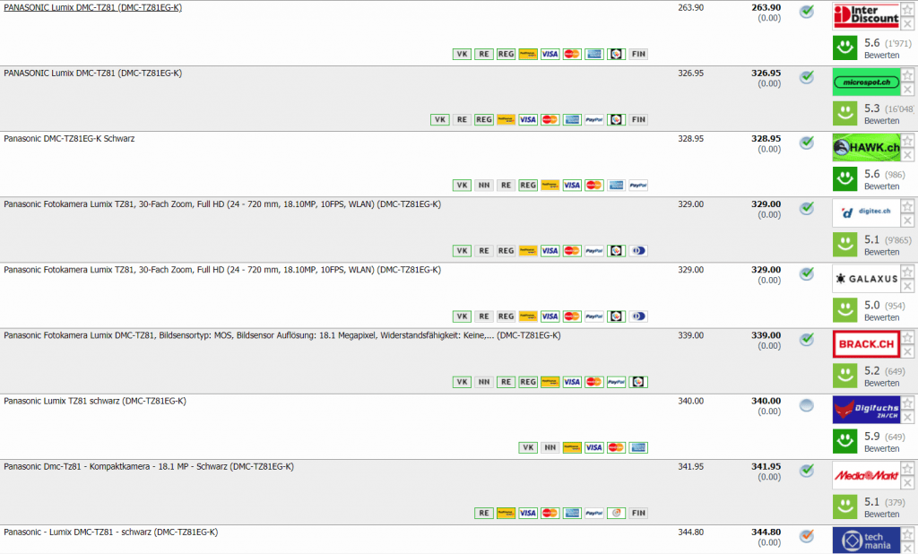Bei Interdiscount erhält man gerade die Digitalkamera Panasonic Lumix DMC-TZ81 für CHF 253.90 wenn man den Gutscheincode HFWID10 beim Checkout angibt. Der zweitbeste Preis in der Schweiz liegt bei CHF 326.95 Der vormalige Bestpreis für die Kamera lag bei CHF 269.90.