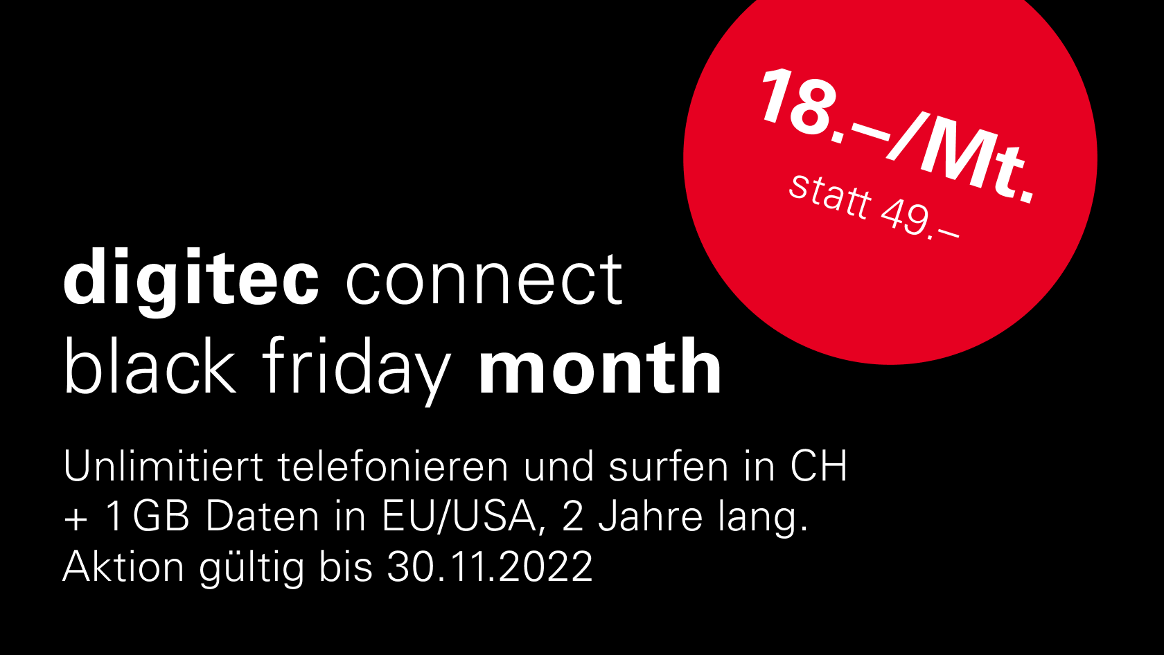 Black Friday Month: Zwei Jahre lang unlimitiert surfen und telefonieren in CH + 1 GB Daten EU/USA für CHF 18.– statt CHF 49.– im Monat.