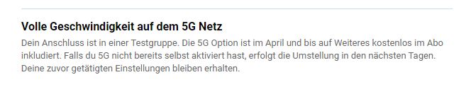 Dein Anschluss ist in einer Testgruppe. Die 5G Option ist im April und bis auf Weiteres kostenlos im Abo inkludiert. Falls du 5G nicht bereits selbst aktiviert hast, erfolgt die Umstellung in den nächsten Tagen. Deine zuvor getätigten Einstellungen bleiben erhalten.