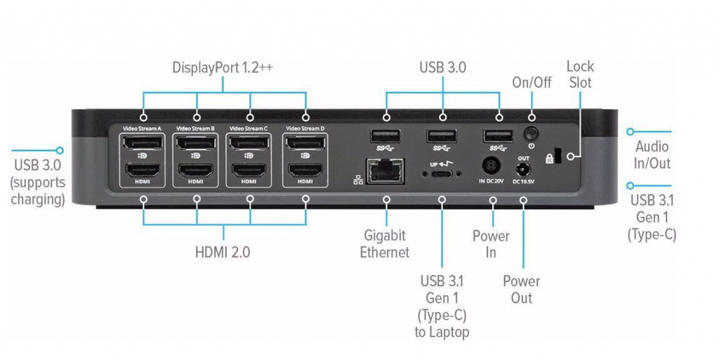 - Audio/Video: 1x Headset-Buchse, 4x DisplayPort (DP++, DP1.2), 4x HDMI (2.0), unterstützt bis zu 4 externe Monitore mit UHD/4K-Auflösung