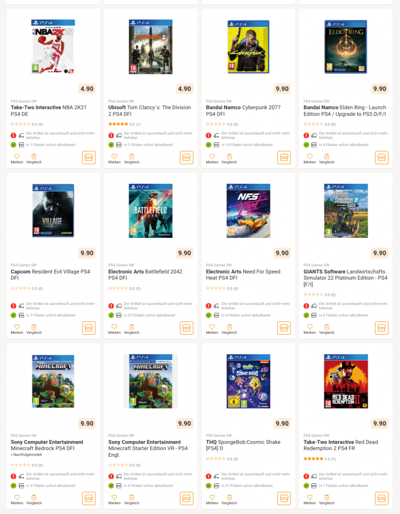 Verschiedene Spiele für PS5 & PS4(unten eine Auflistung), welche eventuell lokal abgeholt werden können. Am besten reserviert man es oder ruft dort schnell an, um wirklich sicher zu gehen. Oder man geht einfach mal hin (hit or miss).