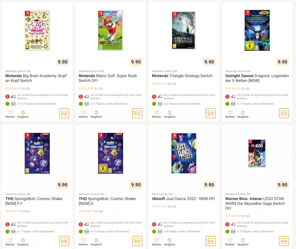 Verschiedene Spiele für die Nintendo Switch (unten eine Auflistung), welche eventuell lokal abgeholt werden können. Am besten reserviert man es oder ruft dort schnell an, um wirklich sicher zu gehen. Oder man geht einfach mal hin (hit or miss).