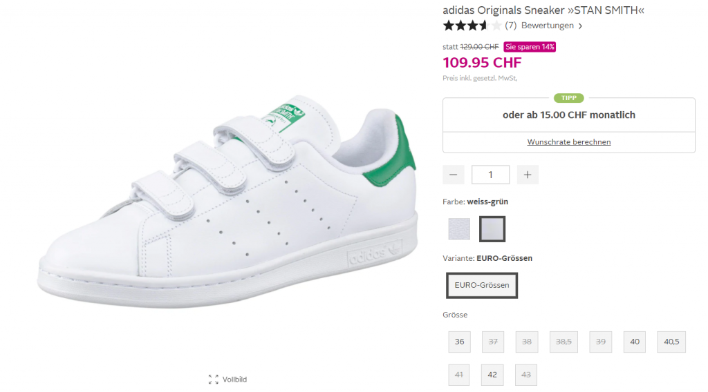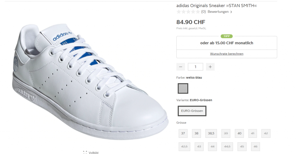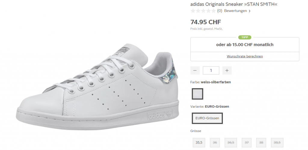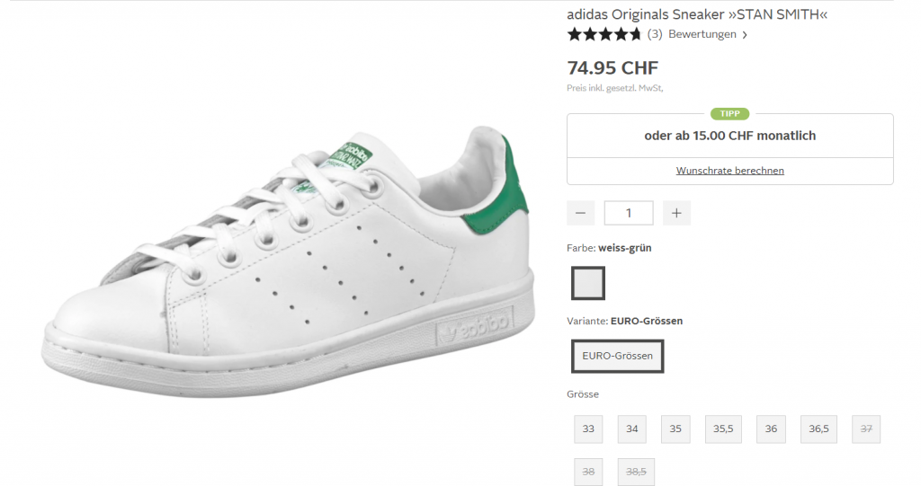 Mit dem Code 13851 gibt’s bei Jelmoli-Shop derzeit bekanntlich 30% Rabatt auf Mode und Schuhe. Dadurch werden diverse Adidas Original Stan Smith (für Damen und Kinder) recht günstig. Leider sind viele Grössen bereits vergriffen.